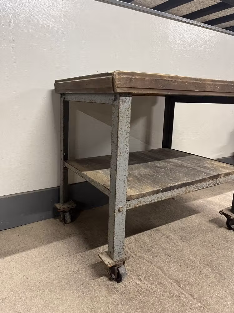 Industribord på hjul. Perfekt som planteringsbord eller som snygg inredningsdetalj. Mått: arbetshöjd 82cm, bredd 63cm, längd 86cm.