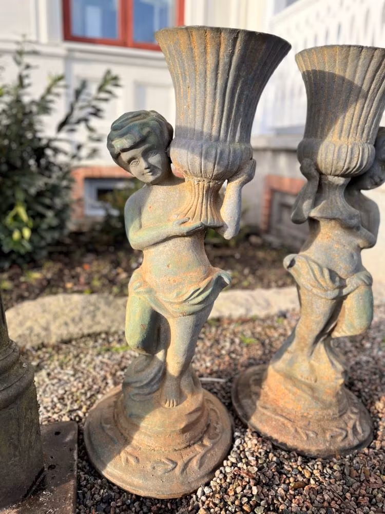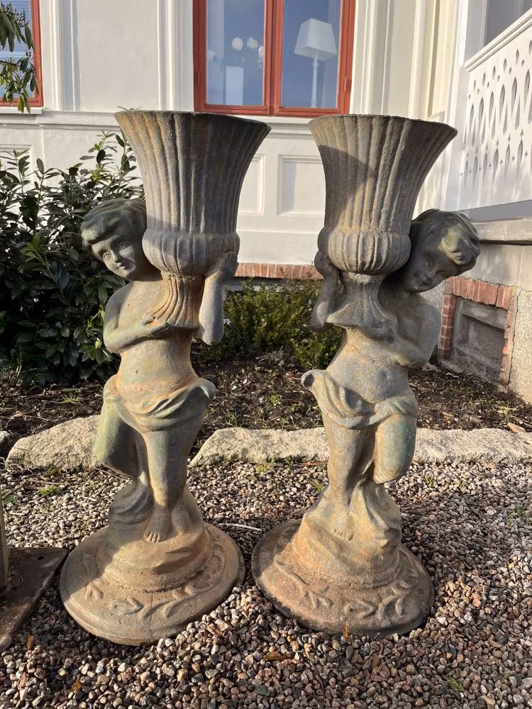 Ett par trädgårdsurnor av gjutjärn. Dekor av stående putto. Grönpatinerad. 1900-talets första hälft. Mått ca 86cm hög.