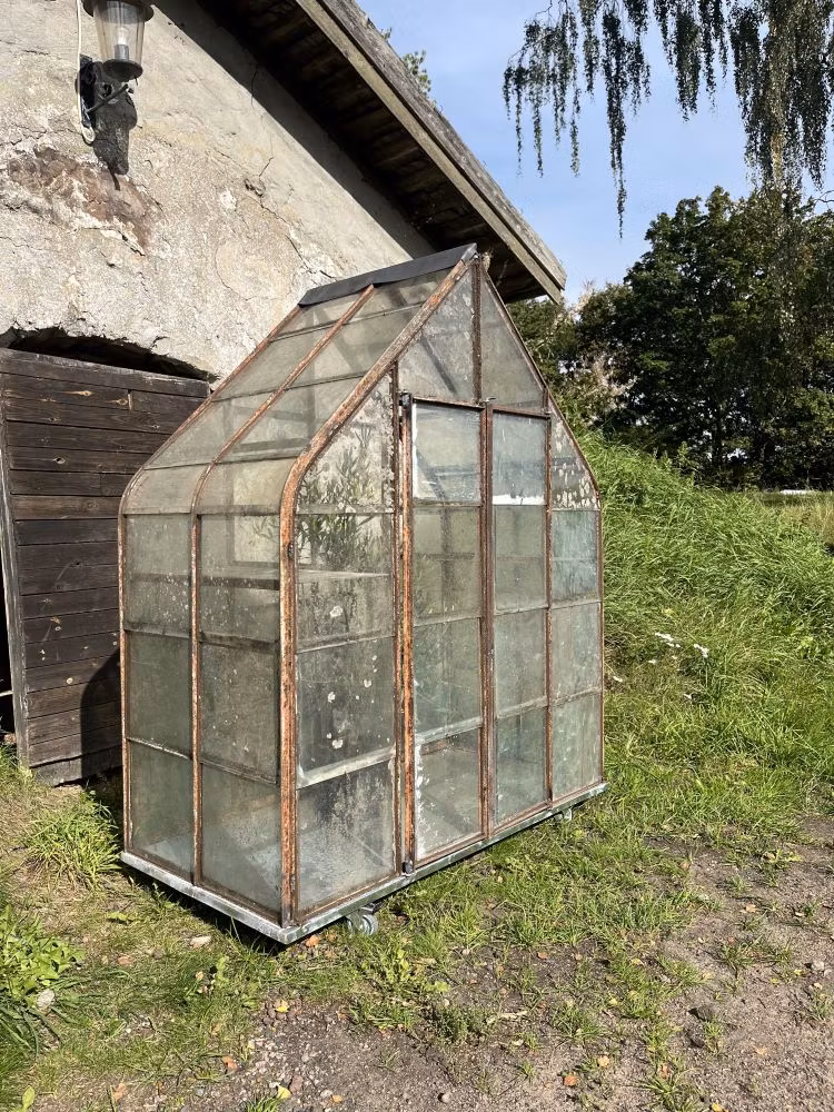 Varje växthus har en unik patina. Växthusen levereras färdigmonterade och har hjul undertill för smidig förflyttning.