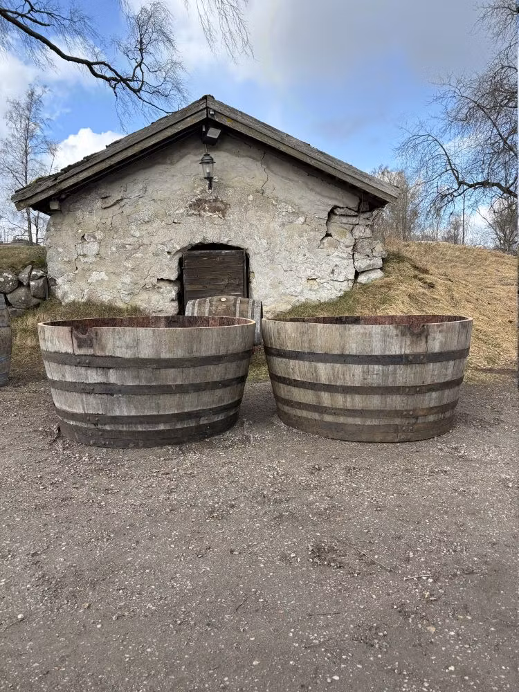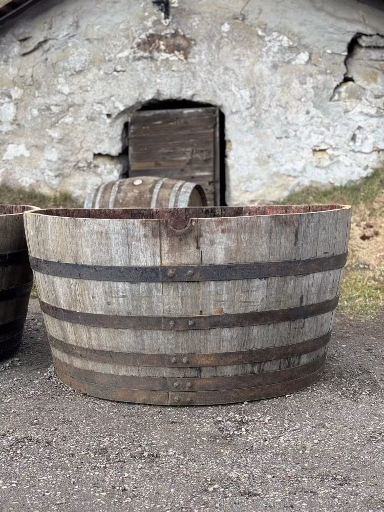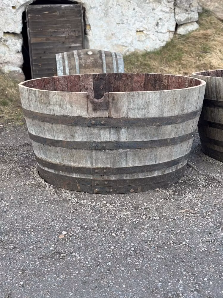 Halvt vinfat om hela 900 liter. Mått: höjd 75cm x bredd 150cm.